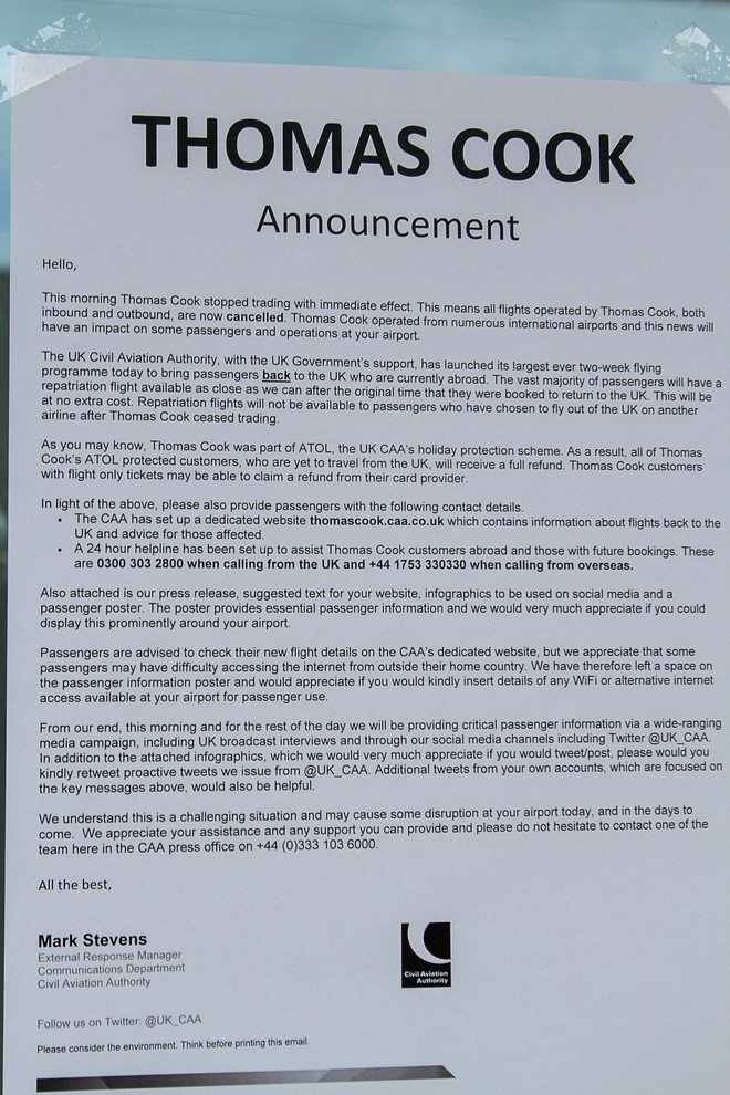 Σε αναβρασμό βρίσκεται από τα ξημερώματα η ταξιδιωτική βιομηχανία και τουρισμός μετά την πτώχευση της Thomas Cook, της αρχαιότερης ταξιδιωτικής εταιρίας στον κόσμο, που μετά από 178 χρόνια ζωής σταμάτησε την λειτουργία της, αφήνοντας δισεκατομμύρια σε χρέη, περισσότερους από 22.000 υπαλλήλους στο δρόμο, βαριά σύννεφα στον ελληνικό Τουρισμό και περισσότερους από 600.000 τουρίστες που πρέπει να επιστρέψουν στις πατρίδες τους.