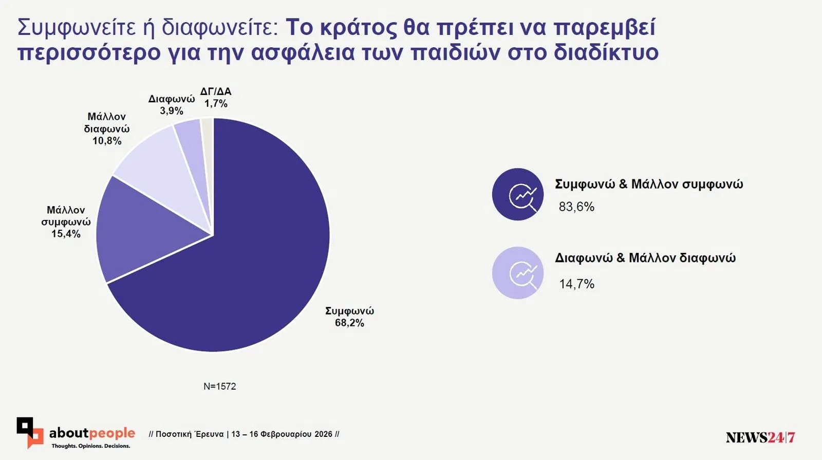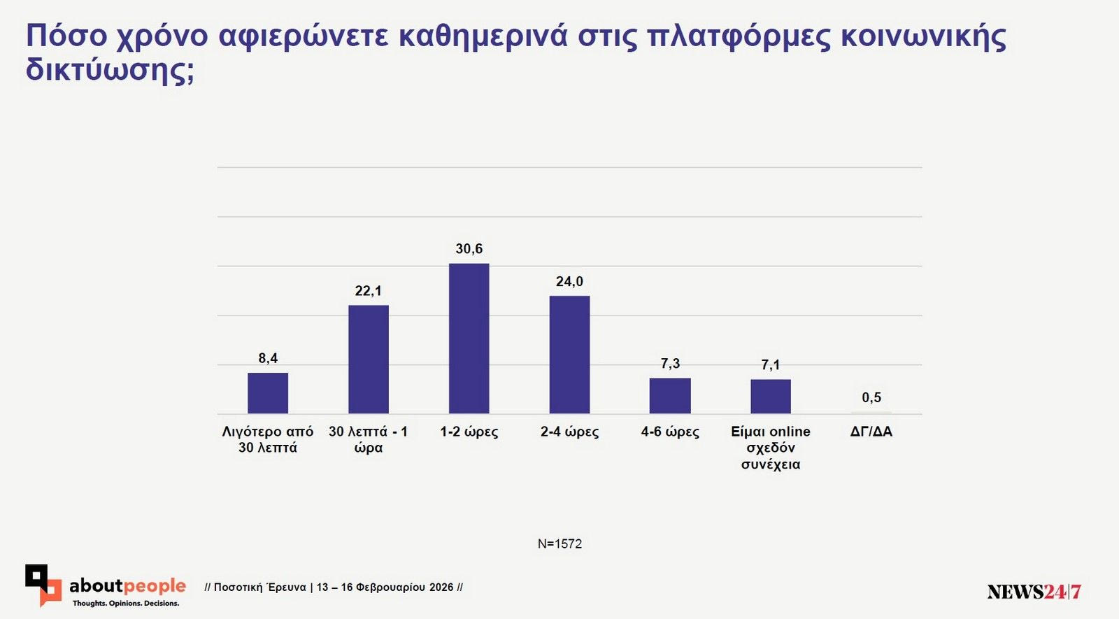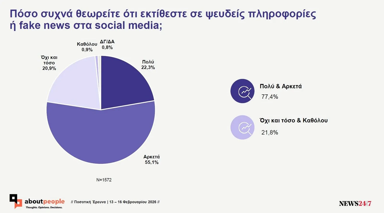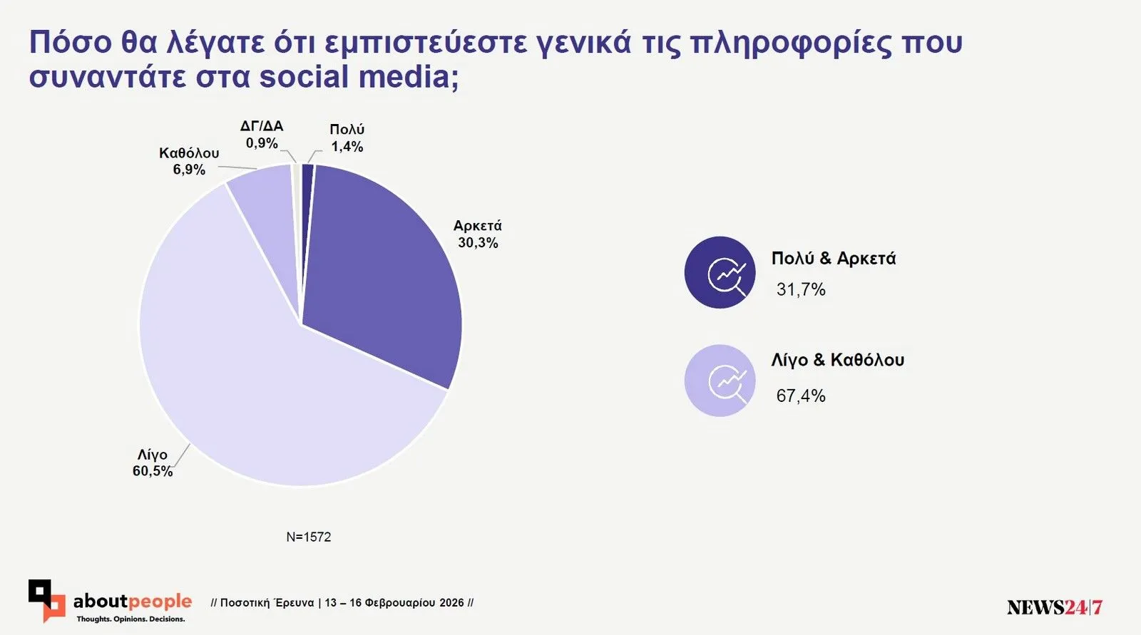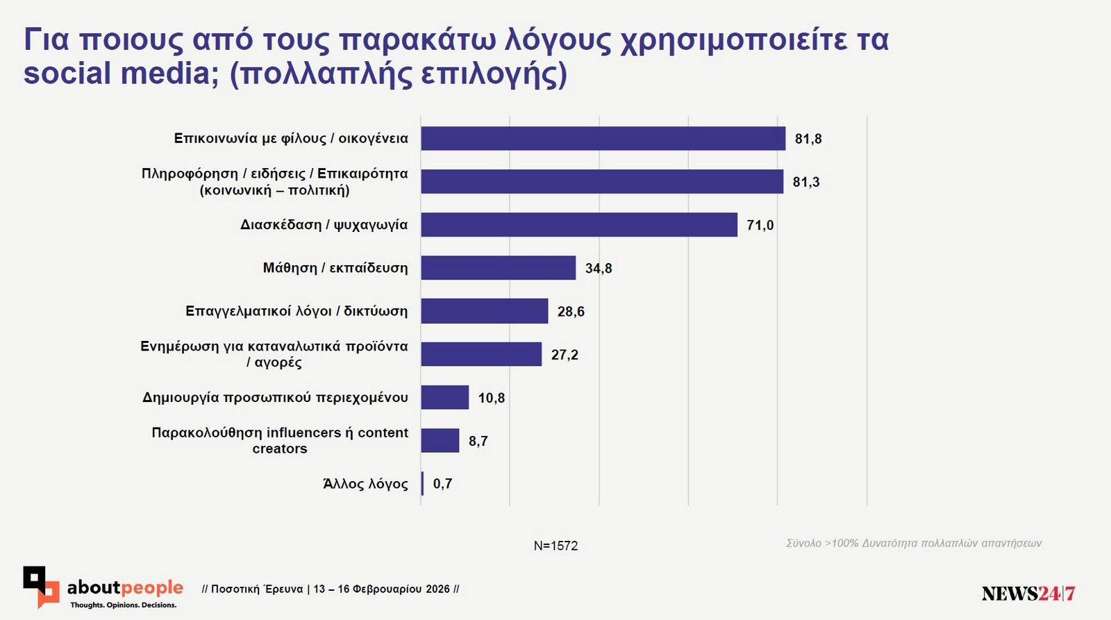 *Η έρευνα πραγματοποιήθηκε στις 13-16 Φεβρουαρίου 2026 σε δείγμα 1572 ατόμων τα οποία είναι χρήστες social media, 17 ετών και άνω, με πανελλαδική κάλυψη. Η συλλογή των δεδομένων έγινε μέσω online panel, με αυτοσυμπληρούμενες ηλεκτρονικές συνεντεύξεις (CAWI).