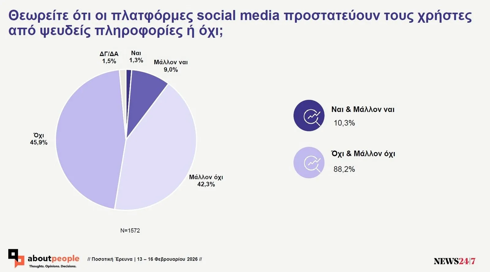 Αναφορικά με το αν οι πλατφόρμες προστατεύουν τους χρήστες από ψευδείς πληροφορίες, το 88,2% απαντά «όχι» και «μάλλον όχι», ενώ το 10,3% θεωρεί ότι οι πλατφόρμες προστατεύουν («ναι» και «μάλλον ναι»).