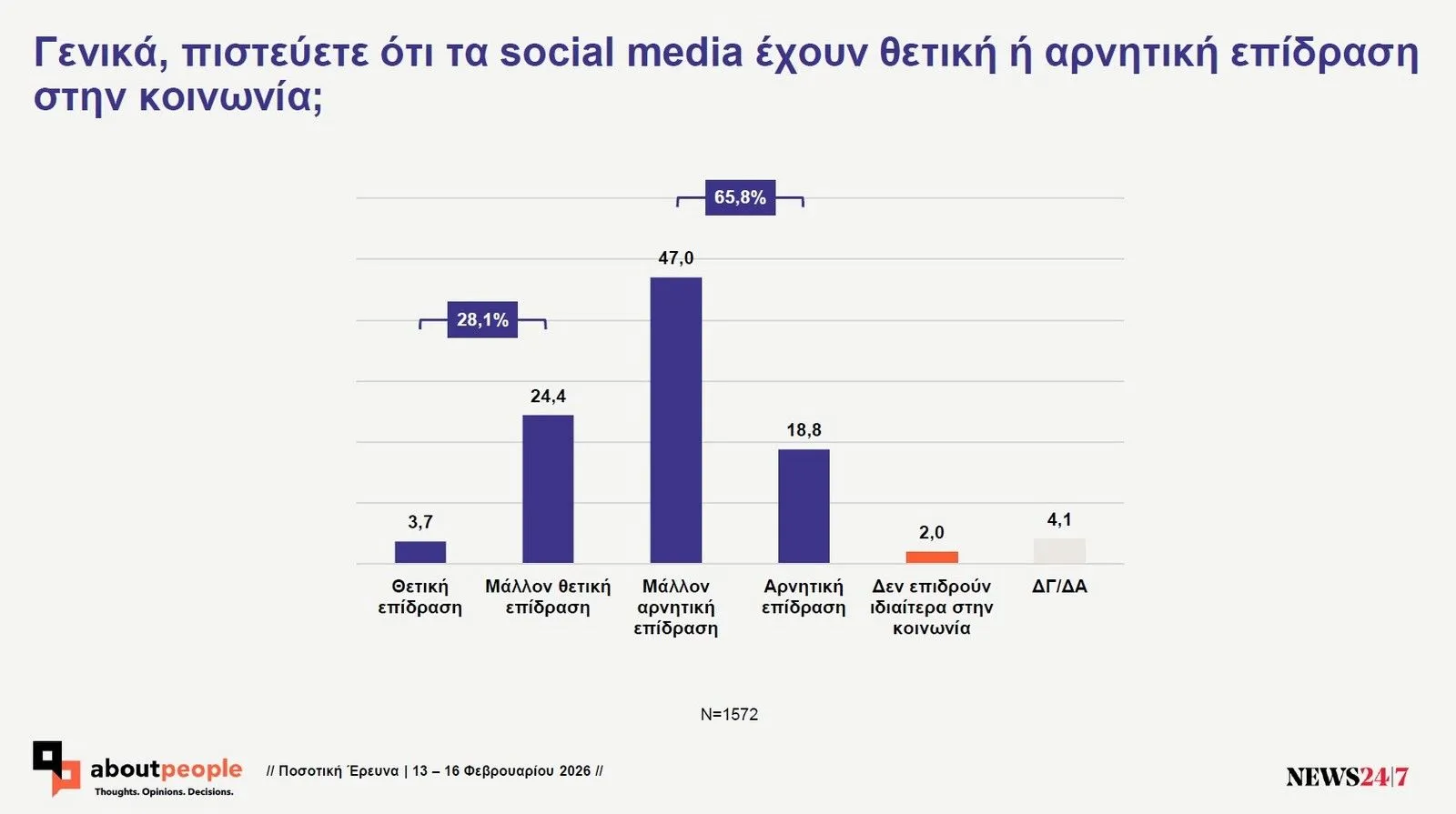 Η έρευνα της aboutpeople για το NEWS 24/7 παρουσιάζει τις απόψεις των Ελλήνων χρηστών για τα social media, τον τρόπο που τα χρησιμοποιούν, τον βαθμό εμπιστοσύνης στις πληροφορίες που συναντούν και τη συνολική αξιολόγηση της επίδρασης των μέσων αυτών στην κοινωνία και στην προσωπική ζωή.
