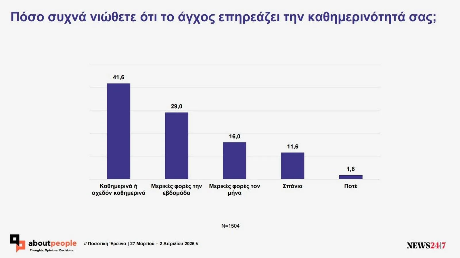Το άγχος φαίνεται να αποτελεί καθοριστικό παράγοντα, καθώς το 41,6% δηλώνει ότι επηρεάζει την καθημερινότητά του σε καθημερινή ή σχεδόν καθημερινή βάση, το 29% μερικές φορές την εβδομάδα, το 16% μερικές φορές τον μήνα, το 11,6% σπάνια και το 1,8% ποτέ.
