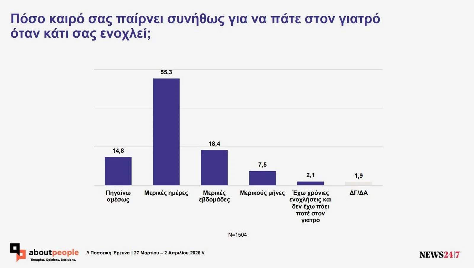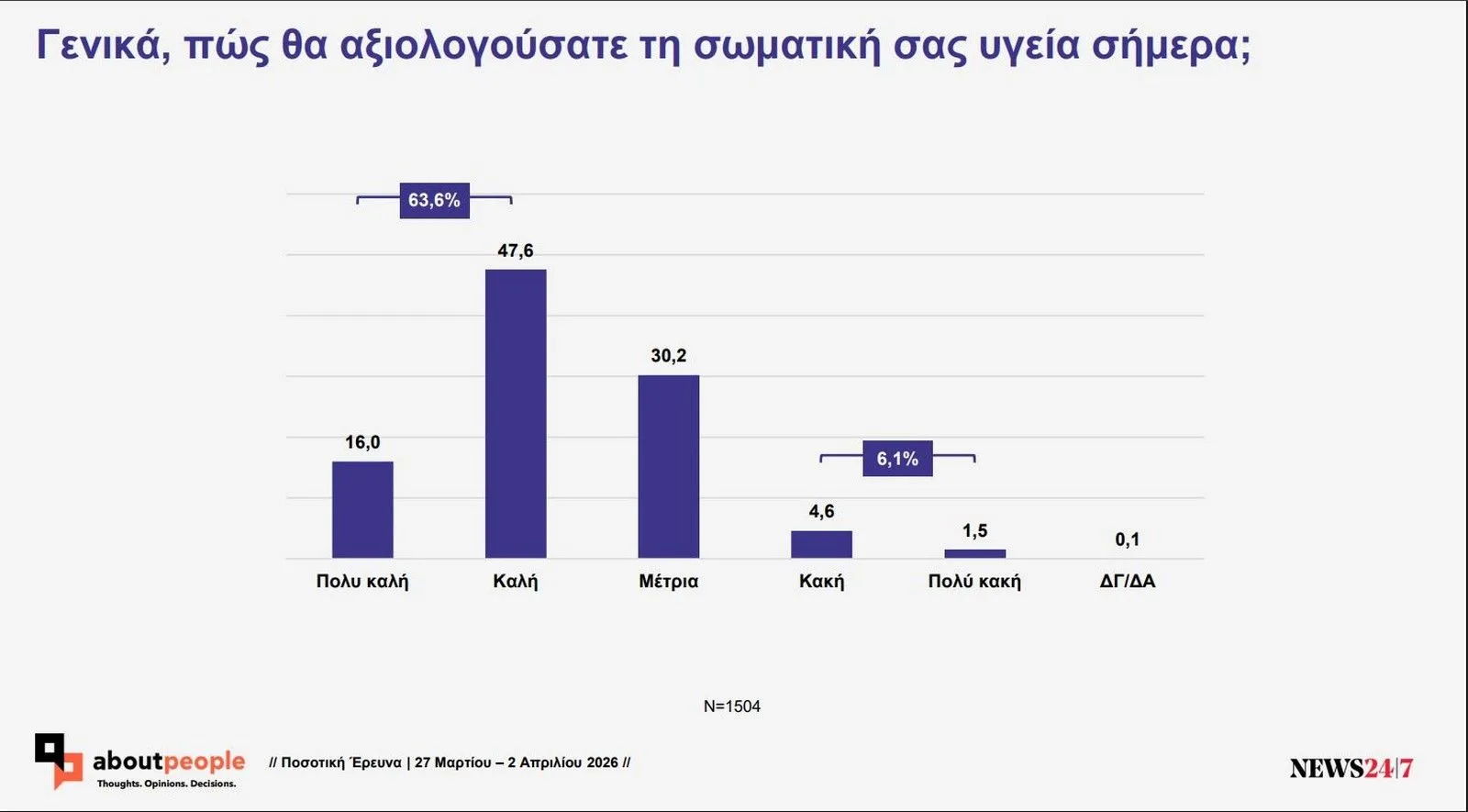 Η έρευνα της aboutpeople για το NEWS247 αποτυπώνει τις στάσεις και τις αντιλήψεις του κοινού στην Ελλάδα σχετικά με τη σωματική και ψυχική υγεία, την καθημερινή φροντίδα του εαυτού τους, τους παράγοντες που την επηρεάζουν και τον τρόπο διαχείρισης ζητημάτων υγείας.