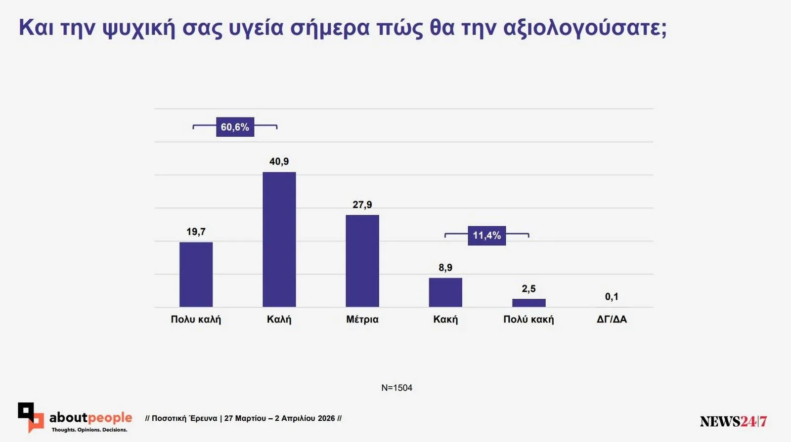 Αντίστοιχα, η ψυχική υγεία αξιολογείται θετικά (πολύ καλή & καλή) από το 60,6%, ως μέτρια από το 27,9% και αρνητικά (πολύ κακή & κακή) από το 11,4%.