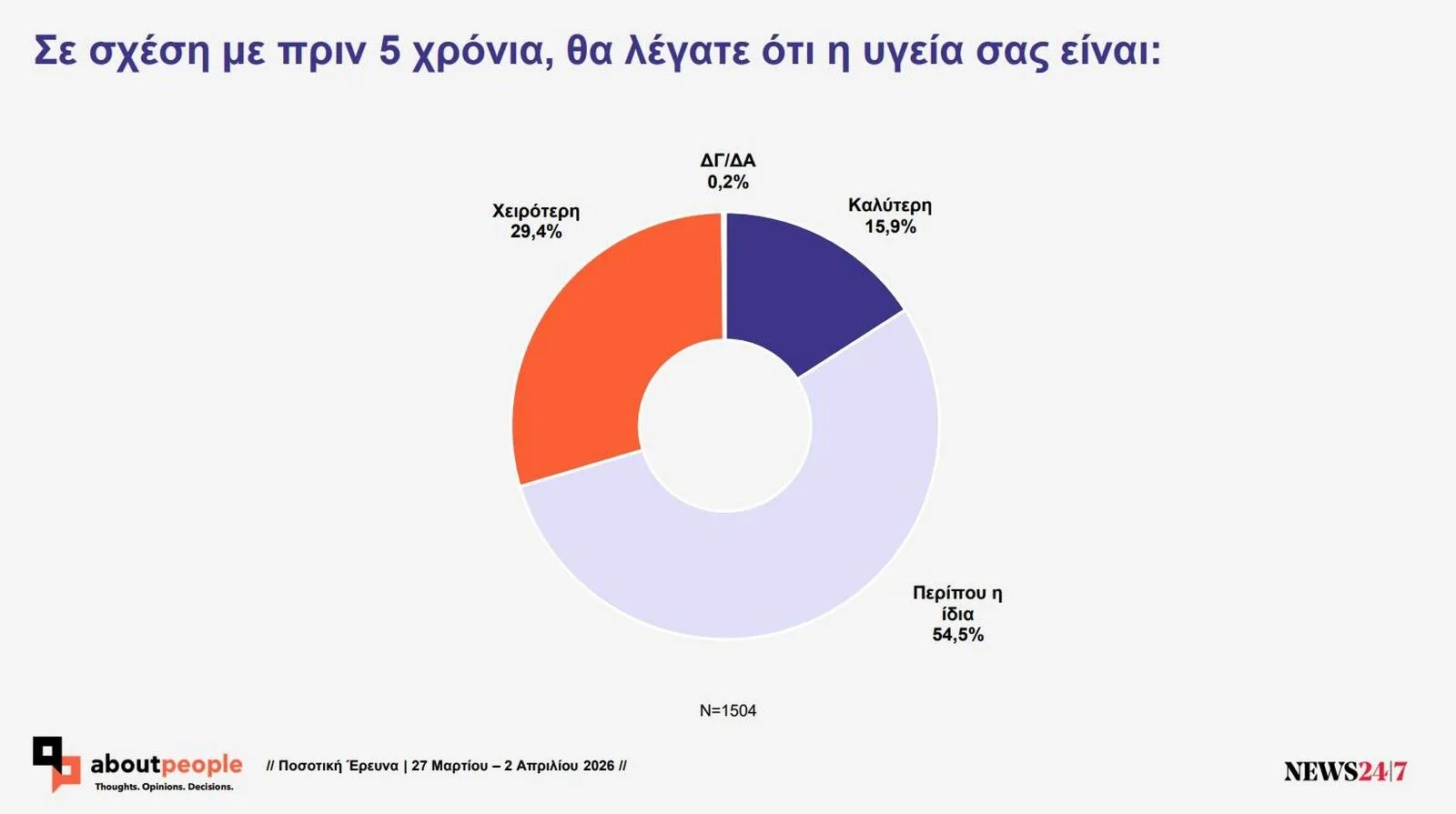Παράλληλα, σε σύγκριση με πριν από πέντε χρόνια, το 54,5% των συμμετεχόντων δηλώνει ότι η κατάσταση της υγείας τους παραμένει περίπου η ίδια, το 29,4% ότι έχει επιδεινωθεί και το 15,9% ότι έχει βελτιωθεί.