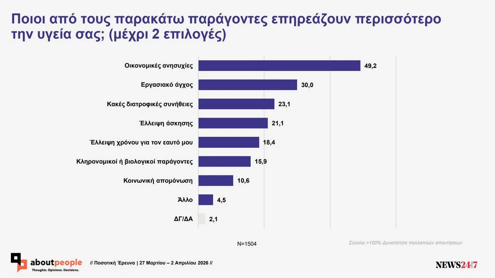 Ως βασικότεροι παράγοντες που επηρεάζουν την υγεία αναδεικνύονται οι οικονομικές ανησυχίες (49,2%) και το εργασιακό άγχος (30%), και ακολουθούν οι κακές διατροφικές συνήθειες (23,1%), η έλλειψη άσκησης (21,1%), η έλλειψη χρόνου για τον εαυτό τους (18,4%), οι κληρονομικοί παράγοντες (15,9%) και η κοινωνική απομόνωση (10,6%).