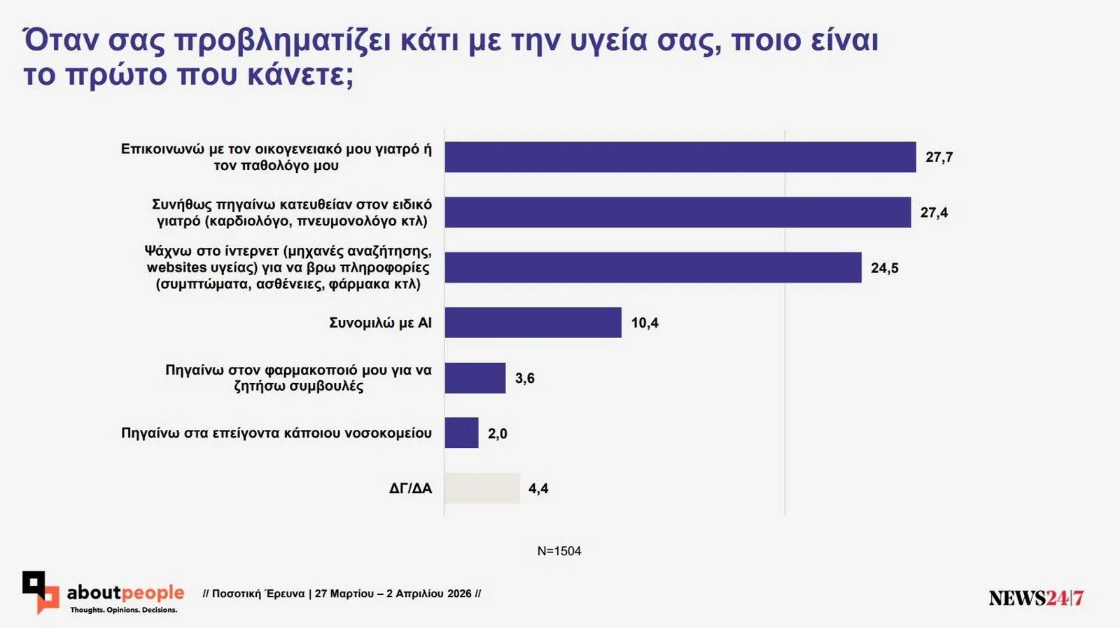 Σε ό,τι αφορά στη διαχείριση θεμάτων υγείας, το 27,7% απευθύνεται αρχικά σε οικογενειακό γιατρό, το 27,4% σε ειδικό γιατρό και το 24,5% αναζητά πληροφορίες στο διαδίκτυο, ενώ μικρότερα ποσοστά δηλώνουν ότι συνομιλούν με εργαλεία τεχνητής νοημοσύνης (10,4%) ή απευθύνονται σε φαρμακοποιό (3,6%) ή στα επείγοντα του νοσοκομείου (2%).