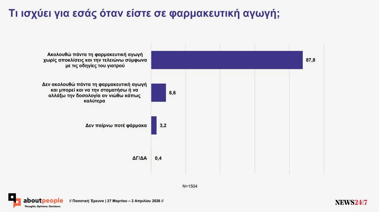 Τέλος, το 87,8% δηλώνει ότι ακολουθεί πιστά τη φαρμακευτική αγωγή χωρίς αποκλίσεις, ενώ το 8,6% παραδέχεται ότι δεν τηρεί πάντα τις οδηγίες και ένα 3,2% δεν παίρνει φάρμακα ποτέ.