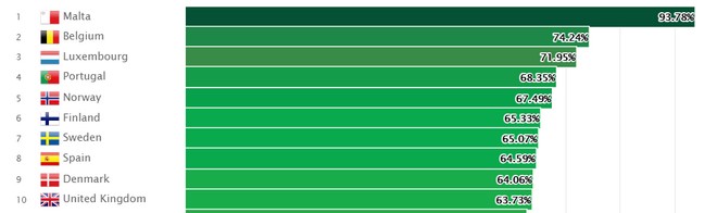 Οι πέντε χώρες που συγκέντρωσαν την υψηλότερη βαθμολογία είναι η Μάλτα 93,78%, το Βέλγιο με 74,24%, το Λουξεμβούργο με 71,95% (σημείωσε μείωση), η Πορτογαλία με 68,35% (σημείωσε σημαντική αύξηση) και η Νορβηγία με 67,49% (σημείωσε μείωση). Ακολουθούν η Φινλανδία, Σουηδία, η Δανία και το Ηνωμένο Βασίλειο.