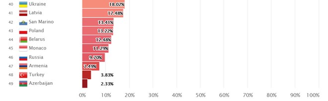Οι χώρες της Ευρώπης και της Κεντρικής Ασίας που συμμετέχουν κατατάσσονται και σε μια λίστα σύμφωνα και με το σκορ που συγκεντρώνουν. Από αυτές, όπως και πέρσι έτσι και φέτος, μόνο οι 17 κατέγραψαν ποσοστό μεγαλύτερο του 50%.