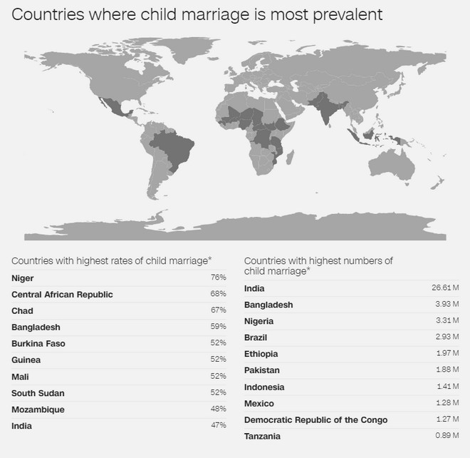Στο Νο1 είναι η Νιγηρία με ποσοστό 76%. Αριθμητικά είναι η Ινδία, με πραγματικό αριθμό κοριτσιών που παντρεύτηκαν μικρά χωρίς τη θέληση τους να φτάνουν τα 26.610.000. Αν συνεχιστεί αυτή η κατάσταση, ο παγκόσμιος αριθμός παιδιών που γίνονται νύφες, θα φτάσει στο 1.2 δισεκατομμύρια, το 2050. Αν νομίσατε πως αυτά γίνονται… μακριά από το δυτικό κόσμο, πρέπει να μάθετε πως περί τα 248.000 ανήλικα κορίτσια παντρεύτηκαν στην Αμερική, μεταξύ του 2000 και του 2010 (σύμφωνα με το Unchained at Last, οργανισμός μη κερδοσκοπικού χαρακτήρα που βοηθά τα κορίτσια να ξαναφτιάξουν τις ζωές τους, μετά τους καταναγκαστικούς γάμους). Σε 23 πολιτείες των ΗΠΑ δεν υπάρχει περιορισμός, σε ηλικία γάμου.
