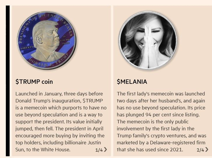 Λίγες μέρες πριν αναλάβει τα καθήκοντά του, ο Τραμπ λάνσαρε memecoins συνδεδεμένα με τον ίδιο και τη σύζυγό του Μελάνια. Η ανάλυση των FT δείχνει ότι τα tokens, τα οποία δεν έχουν κανέναν άλλο σκοπό παρά μόνο για κερδοσκοπία, απέφεραν περίπου 427 εκατομμύρια δολάρια σε προμήθειες πωλήσεων και συναλλαγών.