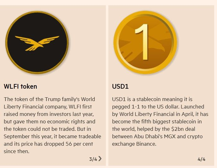 Σύμφωνα με υπολογισμούς των FT, η επιχείρηση έχει κερδίσει μέχρι στιγμής 550 εκατομμύρια δολάρια από τις πωλήσεις του WLFI token, ένα διαπραγματεύσιμο token διακυβέρνησης που δίνει στους κατόχους δικαιώματα ψήφου σε θέματα πολιτικής της World Liberty Financial. Η World Liberty Financial έχει επίσης πουλήσει 2,71 δισεκατομμύρια δολάρια από το stablecoin USD1. Ο Ντέιβιντ Ουάκσμαν, εκπρόσωπος της World Liberty Financial, αρνήθηκε να σχολιάσει.