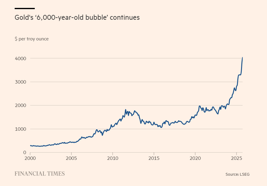 Όταν έκανα το σχόλιό μου περί “φούσκας”, ο χρυσός διαπραγματευόταν στα 1.109 δολάρια ανά ουγγιά. Τώρα, μετά από αύξηση άνω του 50% από την αρχή του έτους, διαπραγματεύεται πάνω από 4.000 δολάρια ανά ουγγιά.