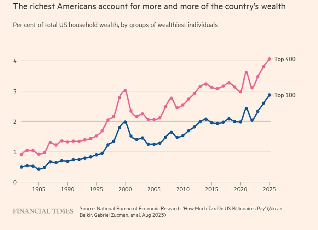 Παγκοσμίως, ο μέσος πλούτος του κορυφαίου 0,0001% του πληθυσμού αυξήθηκε κατά μέσο όρο 7,1% ετησίως μεταξύ 1987 και 2024, σε σύγκριση με το αντίστοιχο 3,2% για τον μέσο ενήλικα, σύμφωνα με τον Gabriel Zucman, καθηγητή οικονομικών στη Σχολή Οικονομικών του Παρισιού και του Μπέρκλεϊ στην Καλιφόρνια.