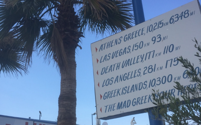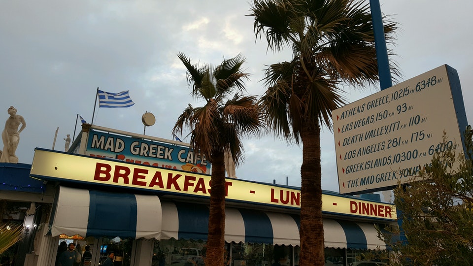 Ο "Λεβέντης" στην έρημο ανάμεσα στο Λος Άντζελες και το Λας Βέγκας ακούει στο όνομα Mad Greek Cafe. Είναι το αποκορύφωμα του ελληνοαμερικάνικου κιτς αλλά και μία μηχανή κοπής ζεστού χρήματος