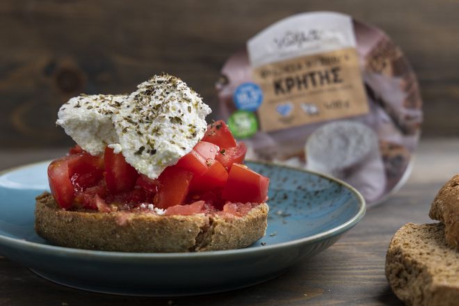 - Τρίβουμε τη μία ντομάτα στον τρίφτη και την άλλη την κόψουμε σε κύβους. Ρίχνουμε πρώτα την τριμμένη ντομάτα πάνω στο παξιμάδι και στη συνέχεια τοποθετούμε και την κομμένη. Τοποθετούμε το τυρί. Προσθέτουμε αλάτι, περιχύνουμε με το ελαιόλαδο και πασπαλίζουμε με ρίγανη.