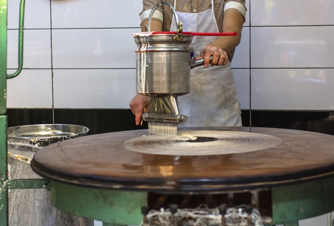 Αλεύρι, νερό και αλάτι μπαίνουν στην τεράστια “βελόνα του πικάπ” και απελευθερώνονται σε λεπτές ροές πάνω στον περιστρεφόμενο δίσκο. Η θερμότητα σχηματίζει άμεσα τις ίνες του κανταϊφιού καθώς το δοχείο με τη ζύμη κινείται από το εσωτερικό προς τα έξω άκρο του δίσκου, διαγράφοντας μια λευκή γραμμή σε όλη την επιφάνεια του δίσκου. Λίγα δευτερόλεπτα αρκούν και ο ηλικιωμένος τεχνίτης τραβά με μια κίνηση το κανταΐφι και το μαζεύει σε ένα δεμάτι. Και η διαδικασία συνεχίζεται.