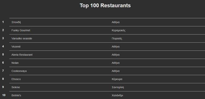 Και φυσικά στις δύο πρώτες θέσεις, είδαμε το Funky Gourmet και την Σπονδή, τα δύο δηλαδή εστιατόρια με δύο αστέρια Μισελέν στη χώρα μας. Δείτε και τα 100 εστιατόρια εδώ