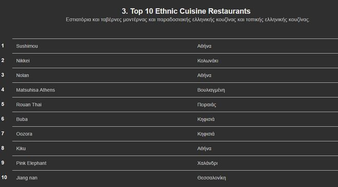 Στην κατηγορία Ethnic Cuisine παρήλασαν τα φημισμένα εστιατόρια με αναφορές στις κουζίνες του κόσμου. Από το ινδικό Pink Elephant στο Χαλάνδρι, ως το εξωτικό ταϋλανδέζικο Buba από την Κηφισιά, κυριάρχησαν οι ασιατικές κουζίνες. Στις πρώτες τρεις θέσεις, συναντάμε το Nolan, του προβεβλημένου από το Master Chef, Σωτήρη Κοντιζά, το ατμοσφαιρικό Nikkei που σερβίρει στην πραγματικότητα περουβιανό φαγητό με ιαπωνική τεχνική από την δημιουργική ματιά του Θάνου Στασινού και στην κορυφή το Sushimou, με σεφ τον Αντώνη Δρακουλαράκο.