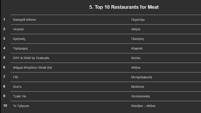 Απόλυτη κυριαρχία της πρωτεύσουσας και στα δέκα καλύτερα εστιατόρια για κρέας στην χώρα, σύμφωνα πάντα με το Restaurant 100. Λαμπρή εξαίρεση το Tzaki ‘Ho από την Θεσσαλονίκη που κατετάγη ένατο. Στην πρώτη θέση το ξακουστό Base Grill από το Περιστέρι, που παρεμπιπτόντως το λιγουρευόμαστε για το απολαυστικό ορεκτικό με τριμμένες πατάτες και τα τηγανιτά αυγά.