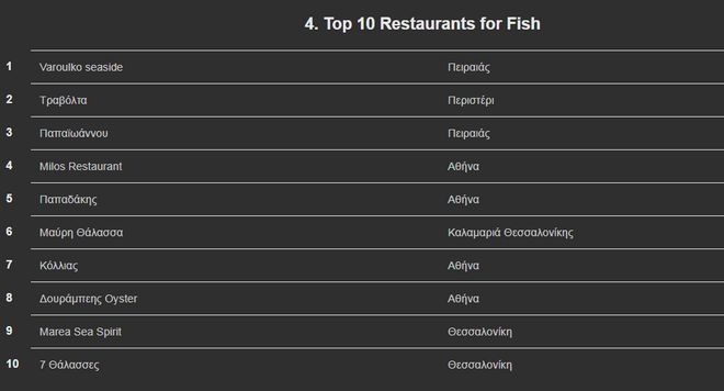 Τρεις οι προσπάθειες από τη Θεσσαλονίκη που έπεισαν τους κριτές για την απαιτητική κατηγορία “ψάρι”. Ωστόσο, την κορυφή κατέλαβε για μια ακόμη φορά το “Βαρούλκο” του Λευτέρη Λαζάρου που συμπληρώνει φέτος 30 χρόνια γαστρονομίας από τον Πειραιά.