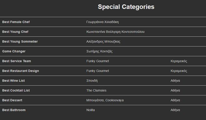 Τέλος, η κριτική επιτροπή απένειμε ειδικά βραβεία στους ανθρώπους και τους χώρους που ξεχώρισαν για κάποιον ιδιαίτερο λόγο μέσα στο 2018. Σε αυτά, η Γεωργιάννα Χιλιαδάκη από το Funky Gourmet πήρε την τιμητική διάκριση της καλύτερης γυναίκας σεφ, με το εστιατόριο για το οποίο εργάζεται να κερδίζει επίσης το βραβείο “καλύτερης ομάδας” και “καλύτερης διακόσμησης”.