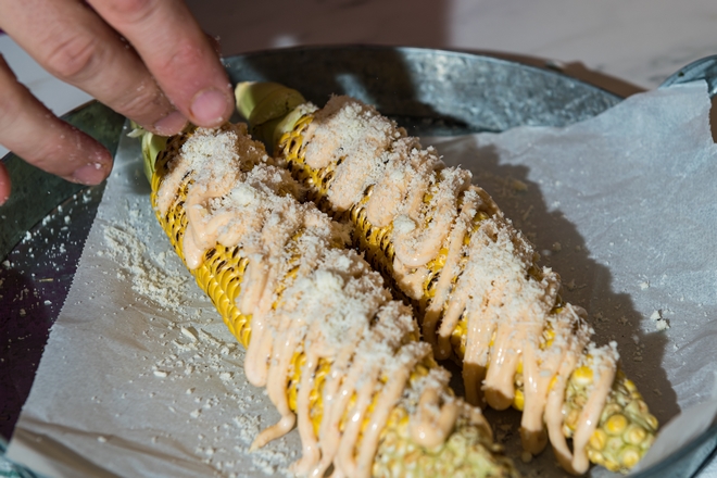 Ψητό καλαμπόκι με πικάντικη μαγιονέζα, παρμεζάνα και μυρώνια