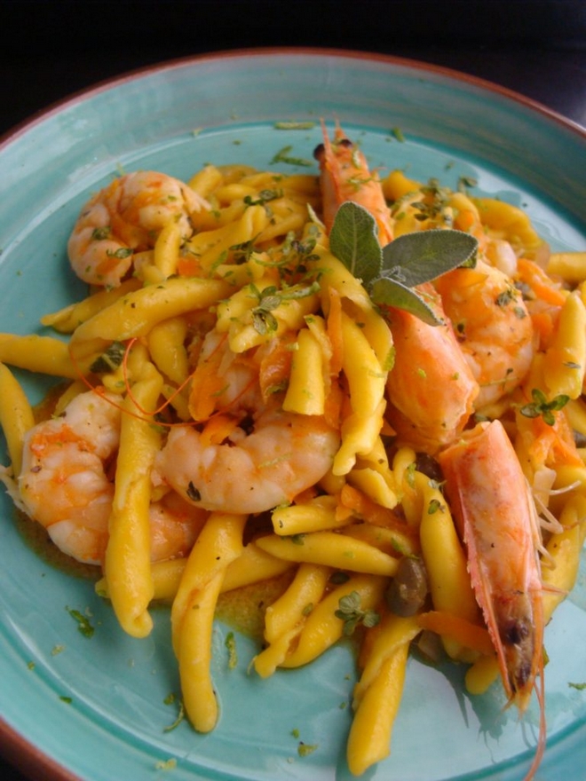 Strozzapreti al limone με γαρίδες, καρότο, και κάπαρη
