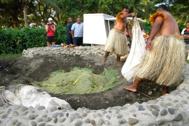 Οι κάτοικοι των εξωτικών νησιών ετοιμάζουν ψάρι τυλιγμένο σε φύλλα μπανάνας, γεμιστό κοτόπουλο και χοιρινό ψημένο σε “Lovo”, έναν αυτοσχέδιο φούρνο από μεγάλες πέτρες σε εξωτερικό χώρο.