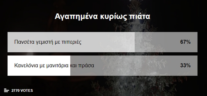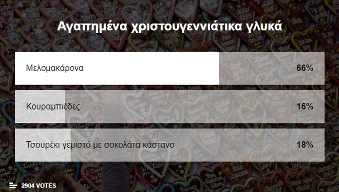 Ως καλύτερο γλυκό αναδείχθηκε το αναμενόμενο. Μελομακάρονα με 66% ξεπέρασαν κουραμπιέδες και τσουρέκι γεμιστό με σοκολάτα κάστανο και έφτασαν στην κορυφή.