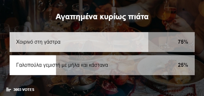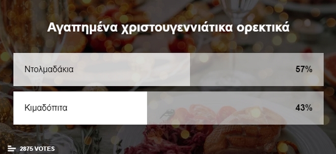Τα ποσοστά μίλησαν. Μελομακάρονα και ντολμαδάκια αναδείχθηκαν ως οι κορυφαίες επιλογές για το χριστουγεννιάτικο τραπέζι. Πάμε τώρα για τον τελικό των τελικών, πάμε να επιλέξουμε το κυρίως πιάτο-νικητή των Χριστουγέννων!
