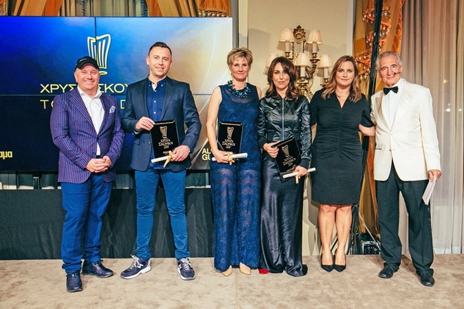 Τα βραβεία για τα εστιατόρια της Χαλκιδικής που συγκέντρωσαν βαθμολογία 15,5/20 κι έναν Χρυσό Σκούφο παρέλαβαν ο σεφ Έκτορας Μποτρίνι και ο Σάκης Σπυριδόπουλος, διευθυντής του «Sani Dunes» για το «Fresco», η Ιουλία Ρίφενσταλ ιδιοκτήτρια του «Squirrel» και η Αλεξάνδρα Ευσταθιάδου (ιδιοκτήτρια «Ekies All Senses Resort») για το «Treehouse». Τα βραβεία απένειμε η Γενική Διευθύντρια της Συνέργεια Α.Ε., αποκλειστικής αντιπροσώπου στην Ελλάδα της Nespresso Professional, Ελένη Μιχοπούλου. Μαζί τους ο συμπαρουσιαστής της βραδιάς Γιώργος Κοτανίδης. STUDIO PANOULIS - PHONE NUMBER: +302103600762 _ ATHENS / GREECE