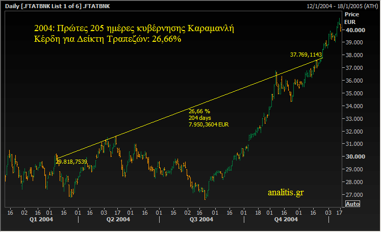 Στις πρώτες 205 ημέρες της κυβέρνησης Καραμανλή το 2004, ο Δείκτης Τραπεζών στο Χρηματιστήριο Αθηνών κατέγραψε κέρδη 26,66%.