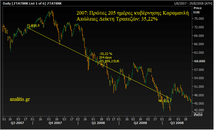 Στις πρώτες 205 ημέρες της κυβέρνησης Καραμανλή το 2004, ο Δείκτης Τραπεζών στο Χρηματιστήριο Αθηνών κατέγραψε απώλειες 35,22%.