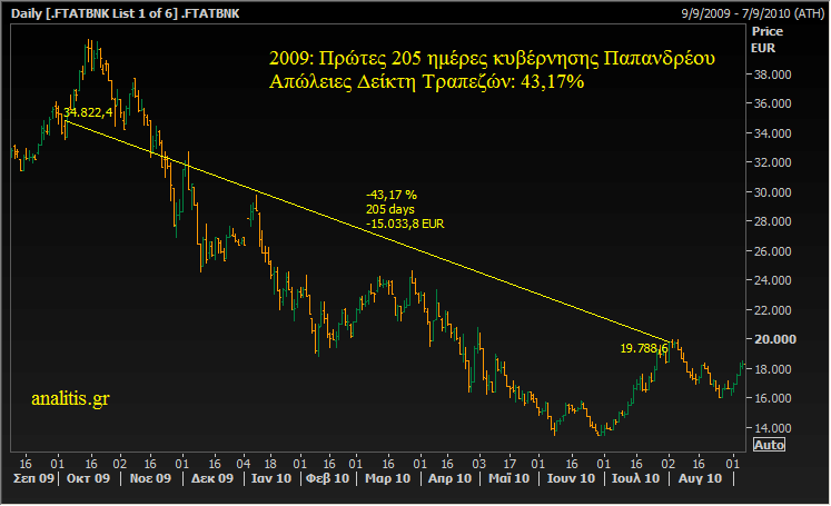 Στις πρώτες 205 ημέρες της κυβέρνησης Παπανδρέου το 2009, ο Δείκτης Τραπεζών στο Χρηματιστήριο Αθηνών κατέγραψε απώλειες 43,17%.