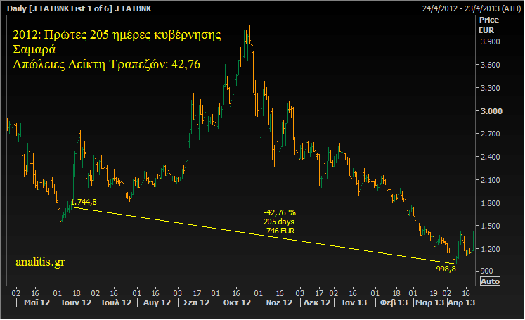 Στις πρώτες 205 ημέρες της κυβέρνησης Σαμαρά το 2012, ο Δείκτης Τραπεζών στο Χρηματιστήριο Αθηνών κατέγραψε απώλειες 42,76%.