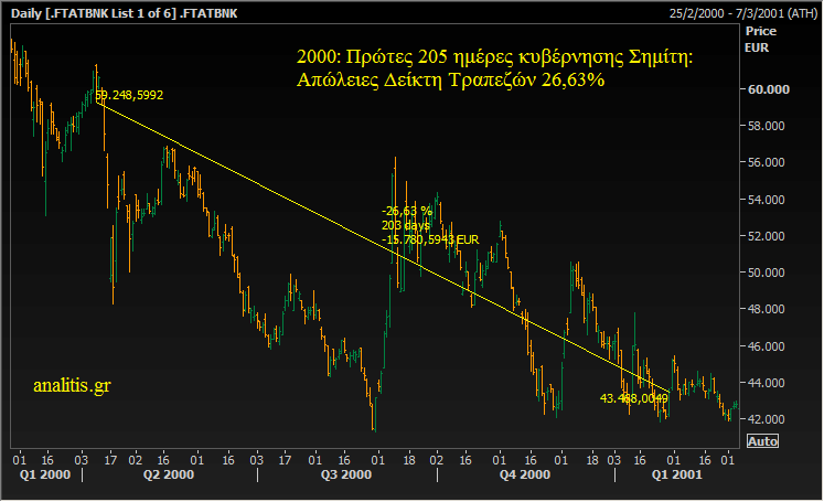 Στις πρώτες 205 ημέρες της κυβέρνησης Σημίτη το 2000, ο Δείκτης Τραπεζών στο Χρηματιστήριο Αθηνών κατέγραψε απώλειες 26,63%.