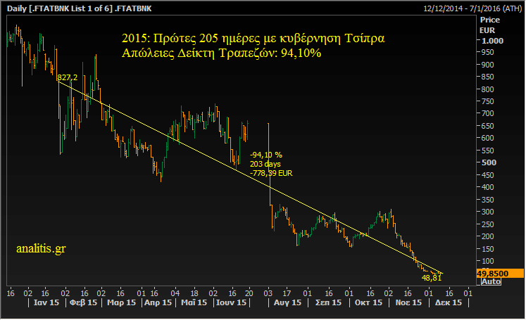 Στις πρώτες 205 ημέρες της κυβέρνησης Τσίπρα το 2015, ο Δείκτης Τραπεζών στο Χρηματιστήριο Αθηνών κατέγραψε απώλειες 94,10%.