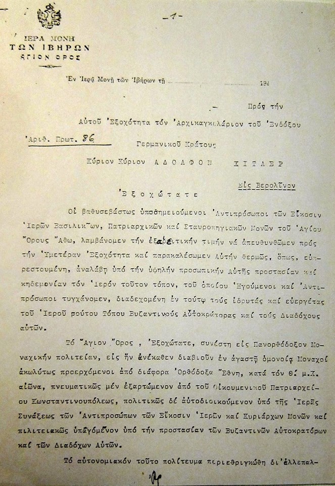 Δεν ξέρω για το φύλο, αλλά οι Αθωνίτες δεν αλλάζουν το φύλλο, και στέλνουν οργισμένες επιστολές. Το συνηθίζουν αυτό, να στέλνουν δριμείες και εισαγγελικές επιστολές εκεί που μπορούν, χατζηαβάτικες εκεί που δεν τους παίρνει…. Να, ας πούμε, πριν από 76 χρόνια, τον Ιούλιο του 1941, είχαν στείλει μια επιστολή, με αριθμό πρωτοκόλλου 86, προς την «Αυτού Εξοχότητα τον Αρχικαγκελάριον του ενδόξου Γερμανικού Κράτους Κύριον Κύριον Αδόλφον Χίτλερ». Σ’ αυτή την επιστολή λοιπόν οι Αντιπρόσωποι των είκοσι Μονών «παρακαλούν θερμώς την Υμετέρα Εξοχότητα, όπως ευαρεστούμενη, αναλάβη υπό την υψηλήν, προσωπικήν Αυτής προστασίαν και κηδεμονίαν τον Ιερόν τούτον τόπον, του οποίου Ηγούμενοι και Αντιπρόσωποι τυγχάνομεν, διαδεχομένη εν τούτω τους ιδρυτάς και ευεργέτας του ιερού τούτου τόπου Βυζαντινούς Αυτοκράτορας και τους διαδόχους αυτών»…