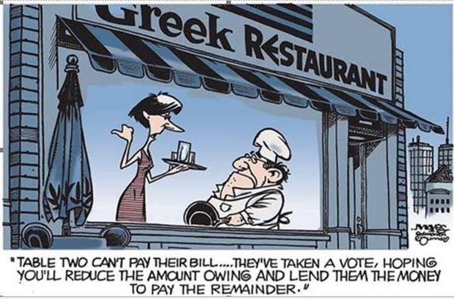 Υπήρξε όμως πρόσφατα και μια όαση γελοιογραφικής απόλαυσης που μεταδόθηκε μέσω διαδικτύου. Σε ελληνικό εστιατόριο, μάλλον των ΗΠΑ, η σερβιτόρα πλησιάζει τον ιδιοκτήτη και με περισσή ψυχρότητα του ανακοινώνει: «οι πελάτες στο τραπέζι 2 δεν μπορούν να πληρώσουν τον λογαριασμό. Εκαναν ψηφοφορία κι αποφάσισαν να σου ζητήσουν να περικόψεις τον λογαριασμό και να τους δανείσεις τα υπόλοιπα για να μπορέσουν να σε πληρώσουν!» Η όποια ομοιότητα με πραγματικές καταστάσεις αφιερώνεται στο μέτωπο της αντι-μνημονιακής ‘αξιοπρέπειας’…