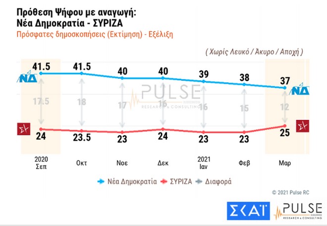 Τώρα η τακτική αυτή φαίνεται ότι πάει να επαναληφθεί. Ο πρωθυπουργός και οι υπουργοί του αναγκάζονται να παραδεχτούν ότι τα παρατεταμένα περιοριστικά μέτρα από τη μία δεν έφεραν τα προσδοκώμενα αποτελέσματα, αφού η πανδημία καλπάζει και από την άλλη έχουν προκαλέσει μεγάλη δυσαρέσκεια, όπως πιστοποιούν όλες οι δημοσκοπήσεις, ακόμα και των πιο φιλικών προς την κυβέρνηση εταιρειών. Η ικανοποίηση από τους χειρισμούς της έχει πέσει γύρω το 40%. Αλλά παρατηρείται και πτώση των ποσοστών της ΝΔ στην πρόθεση ψήφου. Είναι ενδεικτικό ότι από τον περασμένο Σεπτέμβριο το κυβερνών κόμμα έχει χάσει 4,5 μονάδες, όπως δείχνει αυτός ο πίνακας από τη χτεσινή έρευνα της εταιρείας Pulse για τον «Σκάι»).