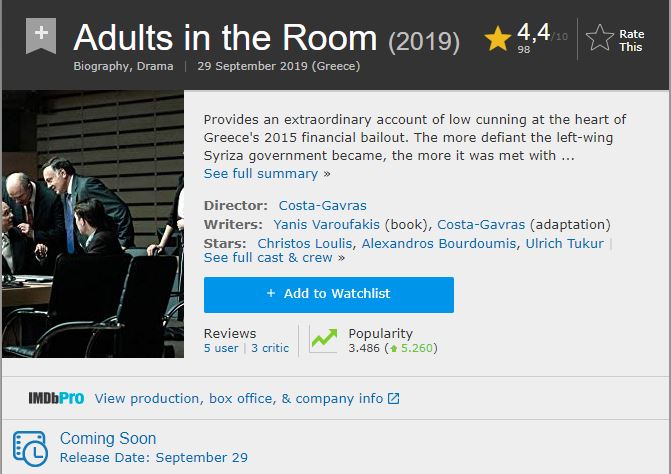 Και επαναλαμβάνουμε. Η ταινία είναι μυθοπλαστική, στηριζόμενη στις ηχογραφήσεις του Βαρουφάκη από τις κλειστές συνεδριάσεις του Eurogroup. Ο ίδιος ο Βαρουφάκης ως πολιτικό πρόσωπο κρίνεται για τις αποφάσεις και την πορεία του από τον ίδιο τον λαό, και το εκλογικό σώμα επέλεξε να τον επαναφέρει στη Βουλή. Το πώς εκφράζεται είναι φυσικά ένα άλλο αντικείμενο κριτικής που οφείλει όμως να λειτουργεί εντελώς ξέχωρα από το ίδιο το φίλμ.