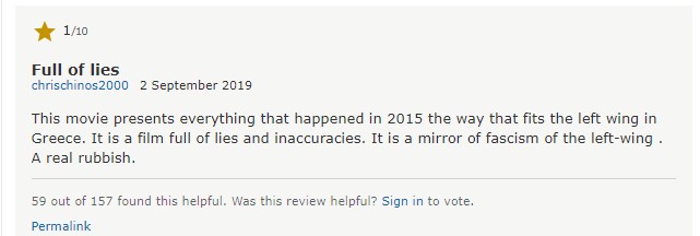 Το ανάθεμα αποτέλεσε εν προκειμένω προϊόν φανατισμού, οι ακόλουθοι των ταγών του διχασμού και της συντήρησης ξεσπάθωσαν με περισσή ευκολία και εν τέλει η λογική πήγε περίπατο για ακόμη μια φορά τα τελευταία χρόνια. Ο διαδικτυακός θόρυβος έφτασε στο Imdb και τα κριτήρια περί τέχνης έγιναν φύλλο και φτερό στον άνεμο της πολιτικής κόντρας και στο πεδίο δόξης εκείνων που επιμένουν να εθελοτυφλούν.