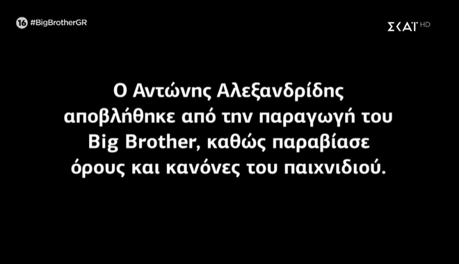 Και κάπως έτσι, ο Αντώνης Αλεξανδρίδης αποβλήθηκε. Ο ΣΚΑΙ εξέδωσε μια ανακοίνωση. Η παραγωγή έστειλε ένα μήνυμα μερικών λέξεων. Και οι παίκτες του “Big Brother” συνέχισαν κανονικά το παιχνίδι στο υπερπολυτελές τους σπίτι. Ψήφισαν, μάλιστα, και για καινούργιο αρχηγό, ενώ ξεκινούν και νέα αποστολή αυτή τη βδομάδα.
