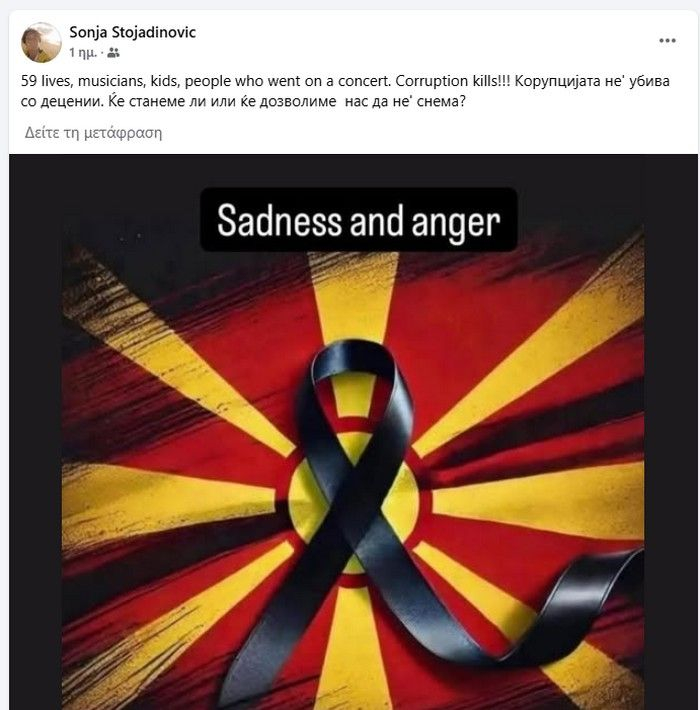 Το συμπέρασμα είναι επίσης κοινό. Δεν υπάρχει ειρήνη χωρίς δικαιοσύνη. “Τhere is no peace if there is no justice” γράφει η Σόνια πριν μας πληροφορήσει ότι για βοήθεια στο δοκιμαζόμενο από την τραγωδία Κότσανι έσπευσαν η Βουλγαρία, η Ελλάδα, η Σερβία, η Τουρκία, η Ολλανδία, η Κροατία ενώ πολίτες από την Ελλάδα, τη Βόρεια Μακεδονία, τη Σερβία, τη Βουλγαρία και άλλες χώρες πρόσφεραν δωρεάν φιλοξενία στους συγγενείς των τραυματιών που νοσηλεύονται στα νοσοκομεία τους.