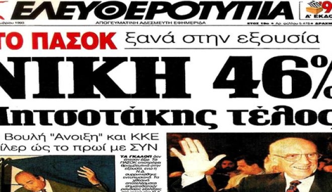 Στις τάξεις της ΝΔ και των συντηρητικών κύκλων εξουσίας της εποχής επικρατούσε ευφορία. Ο Ανδρέας Παπανδρέου, τριπλά ηττημένος και με επιβαρυμένη υγεία, θεωρείτο ξεγραμμένος και οι προβλέψεις για το κόμμα του δυσοίωνες. Διαψεύστηκαν οικτρά. Μέσα σε τρία χρόνια όλα ανετράπησαν και τον Οκτώβριο του 1993 επανήλθε στην εξουσία με 46%. Ιδού ένα πρωτοσέλιδο της εποχής: