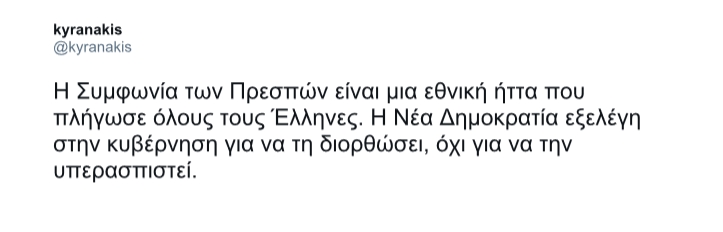 Διότι ο Κυρανάκης, ο Μπογδάνος, ο Πλεύρης δεν είναι οι εξαιρέσεις. Και αυτό που είπε σήμερα για τους «μειοδότες» των Ιμίων του 1996 επαναλήφθηκε πρόσφατα(2019) για άλλους «μειοδότες», αυτούς της Συμφωνίας των Πρεσπών. Το 1996 ήταν ο Σημίτης και οι συν αυτώ, το 2019 ο Αλέξης Τσίπρας και οι λοιποί του ΣΥΡΙΖΑ.
