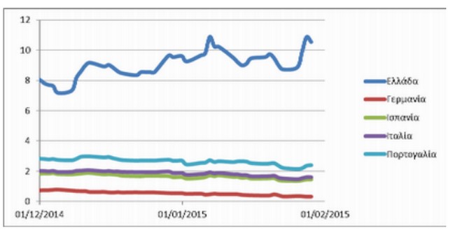 Την 1η Δεκεμβρίου 2014, η απόδοση του Ελληνικού ομολόγου ήταν 8.04%. Από τότε αυξήθηκε, και με διάφορα σκαμπανεβάσματα έχει φτάσει στο 10.54%. Επομένως το κόστος του Ελληνικού Δημοσίου για 10-ετή δανεισμό έχει αυξηθεί κατά 2.5%. Μόνο τη βδομάδα που πέρασε, και ύστερα από τις διάφορες δηλώσεις της νέας κυβέρνησης, η αύξηση ήταν 1.8%. Για να πάρουμε μια ιδέα τι σημαίνουν οι αριθμοί αυτοί, να θυμηθούμε ότι ιδιώτες επενδυτές κατέχουν περίπου 67δις Ευρώ Ελληνικού χρέους. Αν αυτό το χρέος αναχρηματοδοτείται με επιτόκιο 1.8% μεγαλύτερο, το κόστος για το Ελληνικό Δημόσιο θα είναι 67*1.8/100=1.21δις Ευρώ μεγαλύτερο ετησίως.