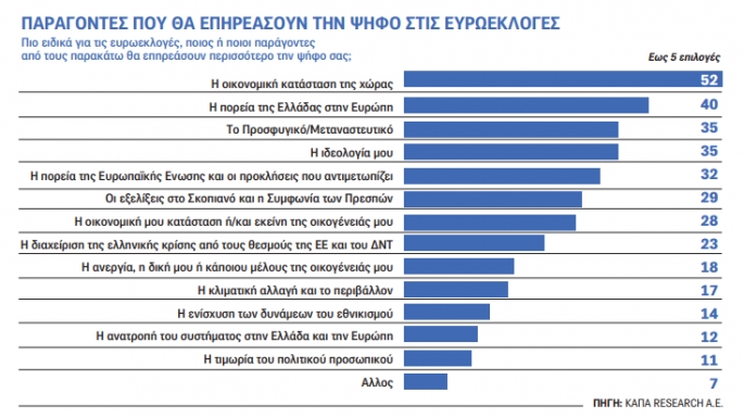 Πέραν όμως από το 52% της οικονομικής κατάστασης της χώρας που εμφανίζεται ως νούμερο ένα παράγοντας, στο 28% είναι το “η οικονομική μου κατάσταση ή/και εκείνη της οικογένειάς μου” και στο 23% έρχεται “η διαχείριση της ελληνικής κρίσης από τους θεσμούς της ΕΕ και του ΔΝΤ”, ενώ στο 18% είναι “η ανεργία, η δική μου ή κάποιου μέλους της οικογένειάς μου”.