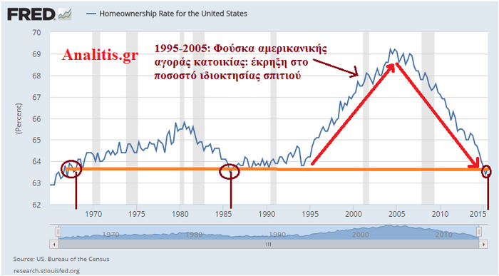 Έκτοτε η αμερικανική και η διεθνής οικονομία μπήκαν σε τροχιά ανάρρωσης, έχοντας, μάλιστα, ξεπεράσει τα προ κρίσης επίπεδα του ΑΕΠ τους. Όμως αυτή η ανάρρωση είναι εύθραυστη από όποια πλευρά και αν τη δει κανείς και μία από τις πιο σκοτεινές της είναι και πάλι η αμερικανική αγορά κατοικίας. Αυτή τη φορά όχι επειδή είναι φούσκα αλλά γιατί δεν κατάφερε ποτέ να επιστρέψει σε έναν υγιή ανοδικό κύκλο, κάτι το οποίο αποτυπώνεται στο ποσοστο ιδιοκτησίας σπιτιών από τους Αμερικανούς, το οποίο από την κορύφωση του το 2005, έχει μπει και παραμένει σε ελεύθερη πτώση.